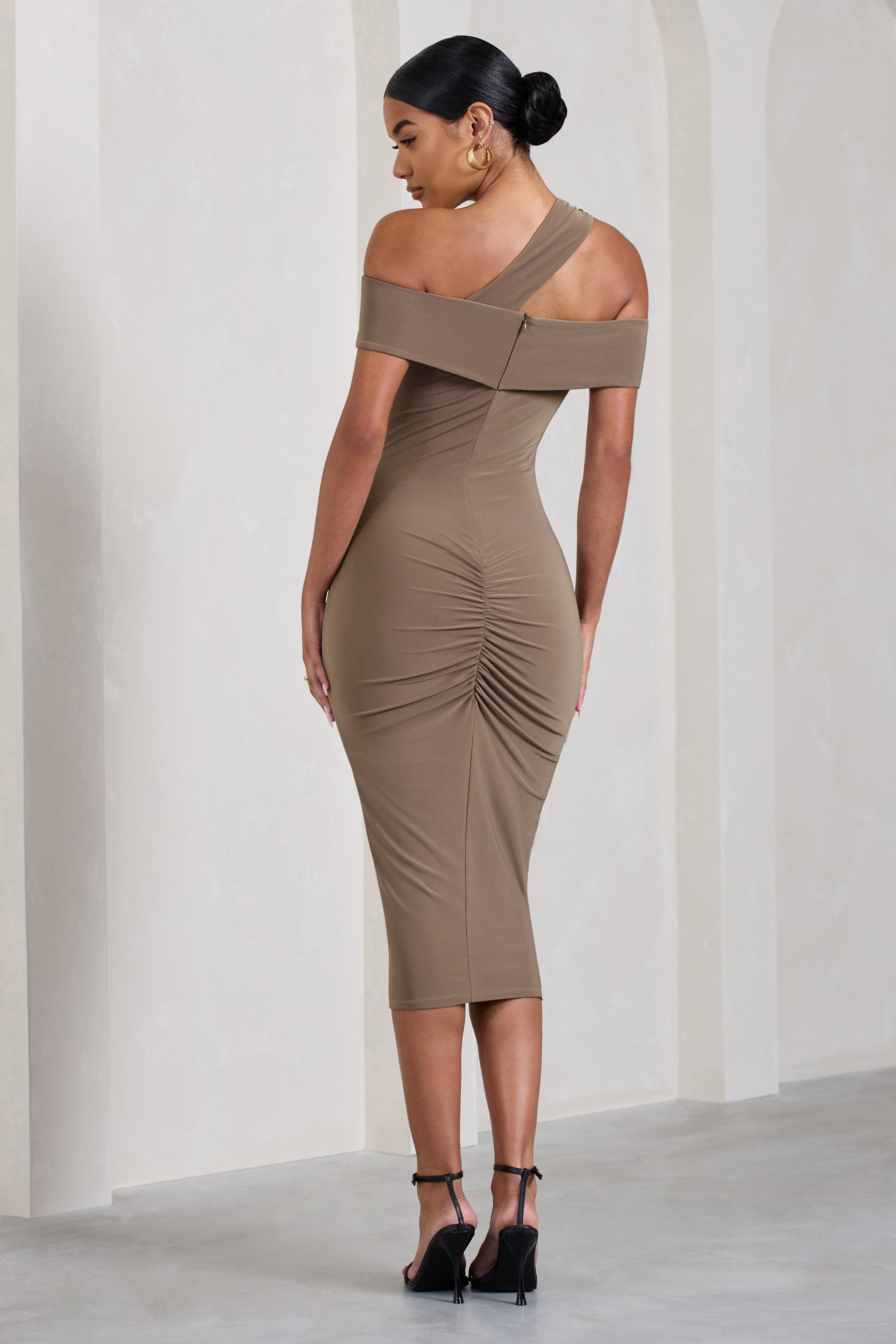 Chain Reaction Mocha Strappy Asymmetric Bodycon Midi Dress