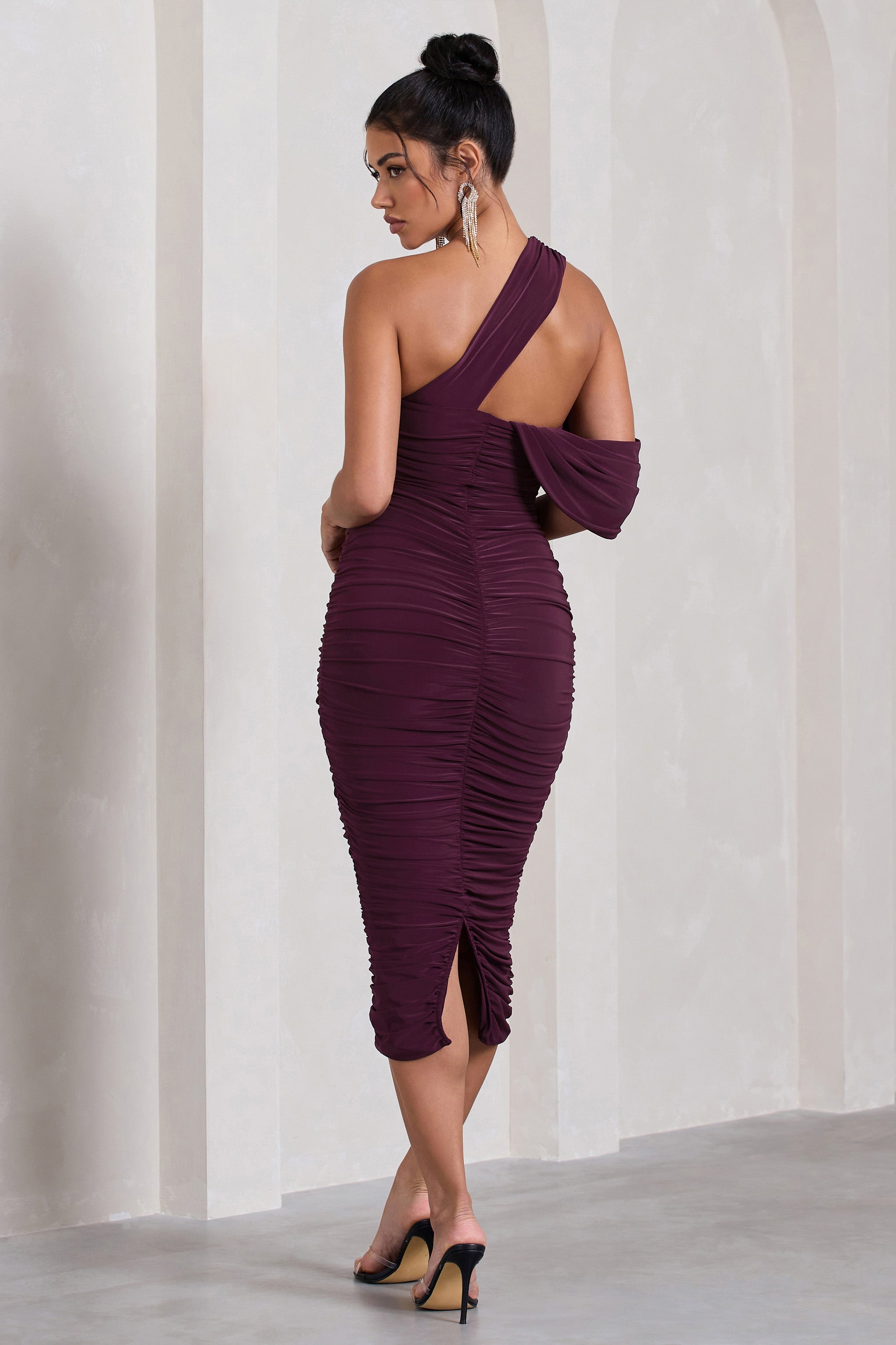 Whether you have an extravagant wedding or evening drinks on your agenda. our Cici midi dress will make your attendance unforgettable. The asymmetric must-have arrives in a rich plum jersey with flattering ruching all over its bodycon silhouette. Cici also features a statement off-shoulder sleeve and a sculpting skirt with a subtle rear split.