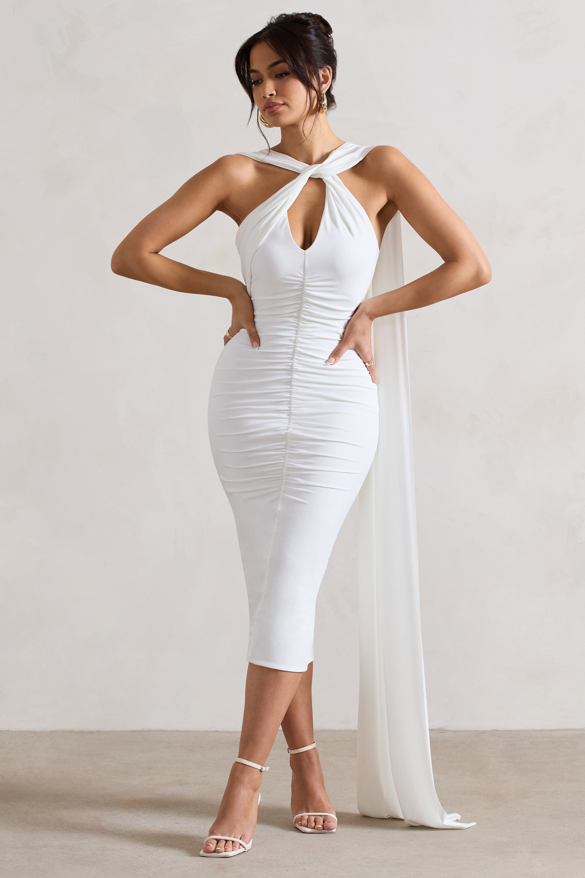 Flatter your figure from all angles in Freedom. our white ruched midi dress. Crafted in our premium stretch jersey. it showcases a captivating chest cut-out. and a low back paired with a statement sash. Try styling Freedom with a sleek bun and our Covergirl heels for your next event.