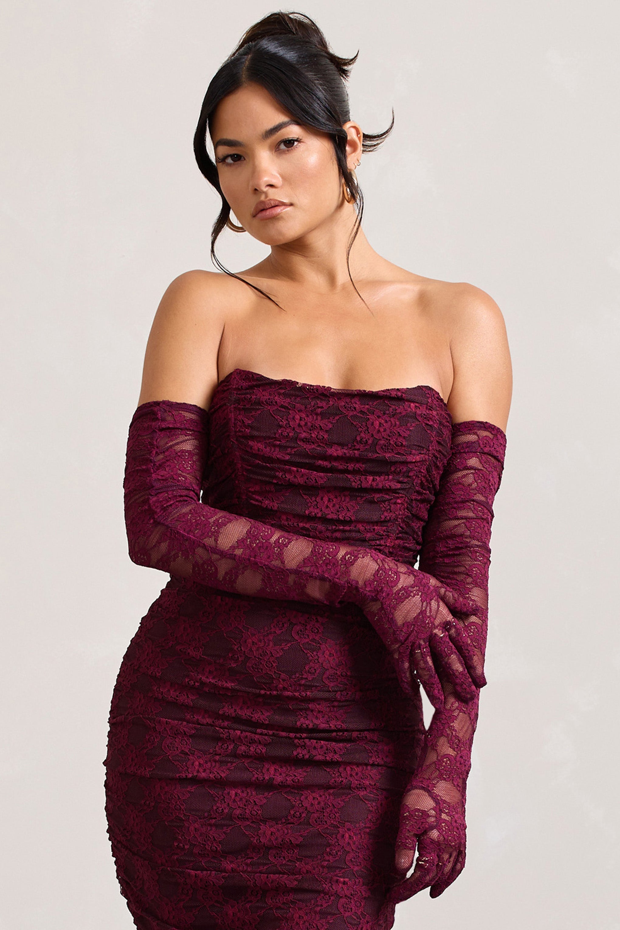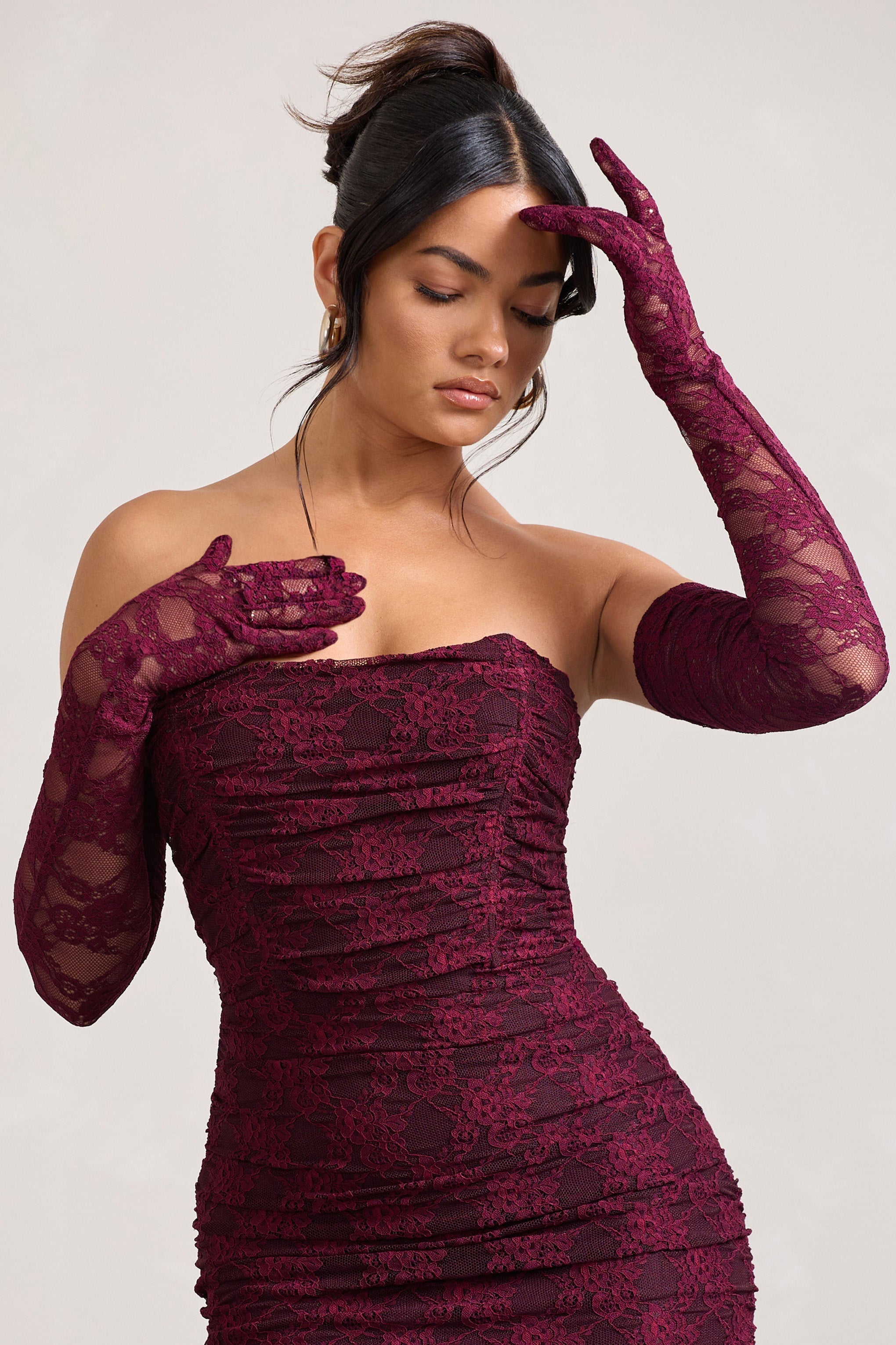 Crafted in a premium luxurious lace. our Prego gloves add a romantic touch to any outfit they are styled with. Arriving in a rich burgundy hue. these gloves are best paired with our matching Paparazzi maxi dress.