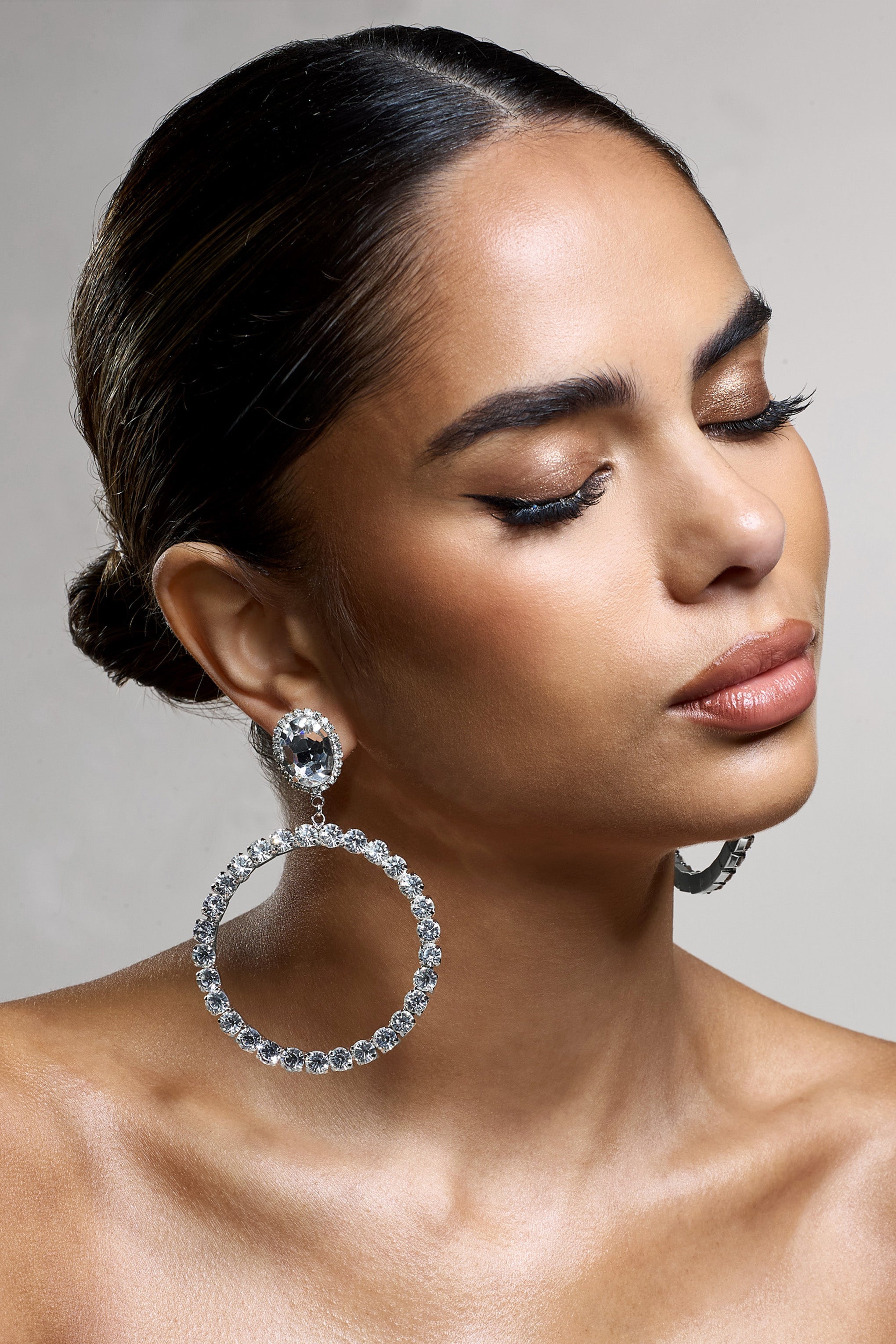 Steal the spotlight on your next night out with To Present. our latest silver statement earrings. Embellished with an eye-catching diamante leading into s drop hoop design. these earrings have it all.
