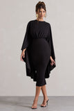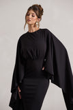 Opt for opulence at your next event with our black midi. Tranquility. Designed in a premium stretch crepe. this dress encapsulates an ethereal mood through its back cape detail and flattering gathered waistline. Team yours with some heels like Lawless for the perfect graduation ensemble.