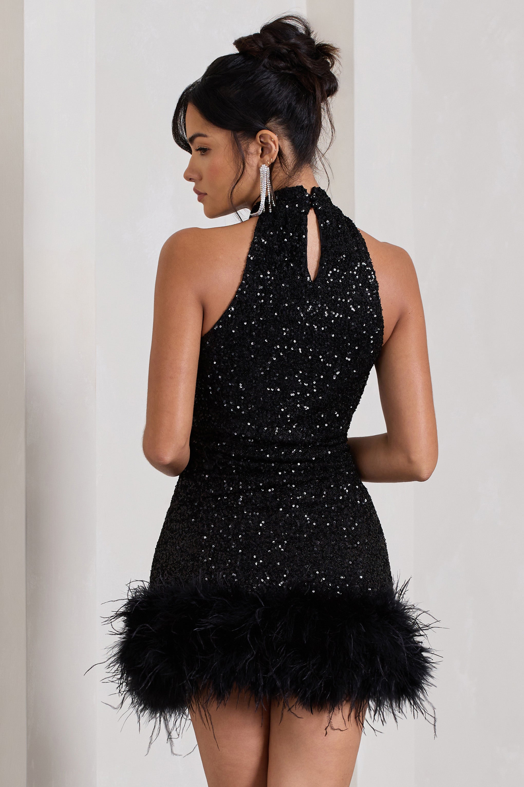 Tillie Black Sequin High Neck Trapeze Mini Dress With Feather Hem Detail