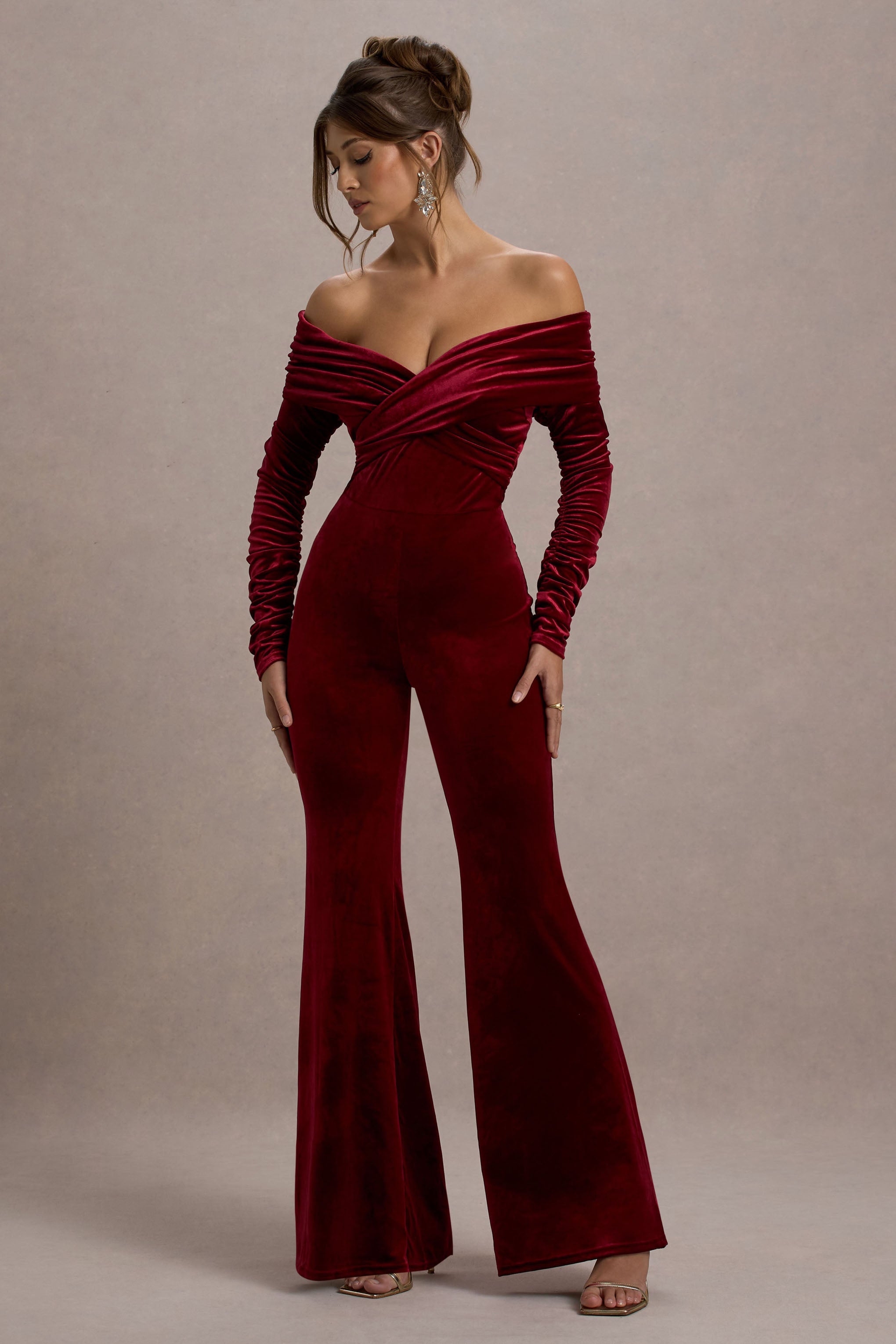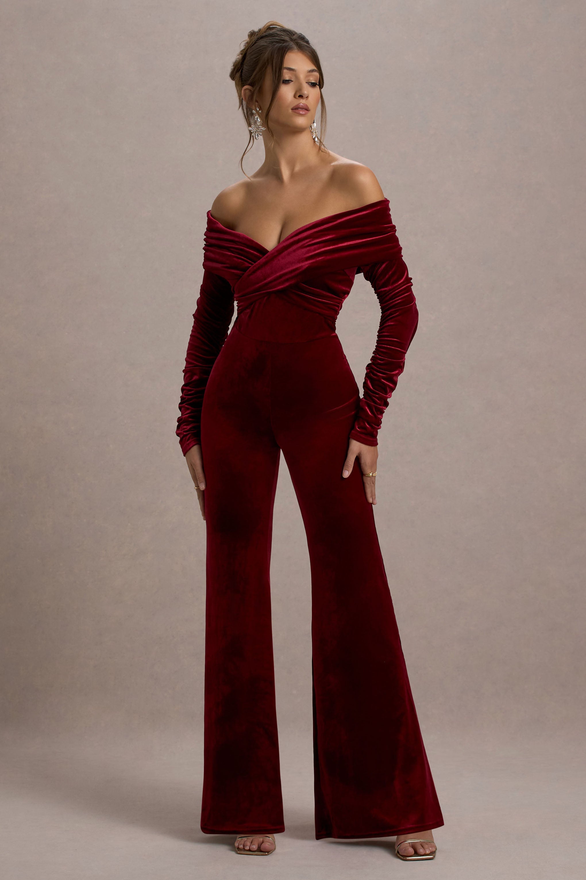 Crafted in a premium stretch velvet. this form-flattering berry jumpsuit arrives in a timeless silhouette to see you through every occasion. Borealis is detailed by a twisted bardot neckline. long ruched sleeves and wide flared-legs. Try styling this opulent piece with strappy stilettos for a sophisticated party-ready look.