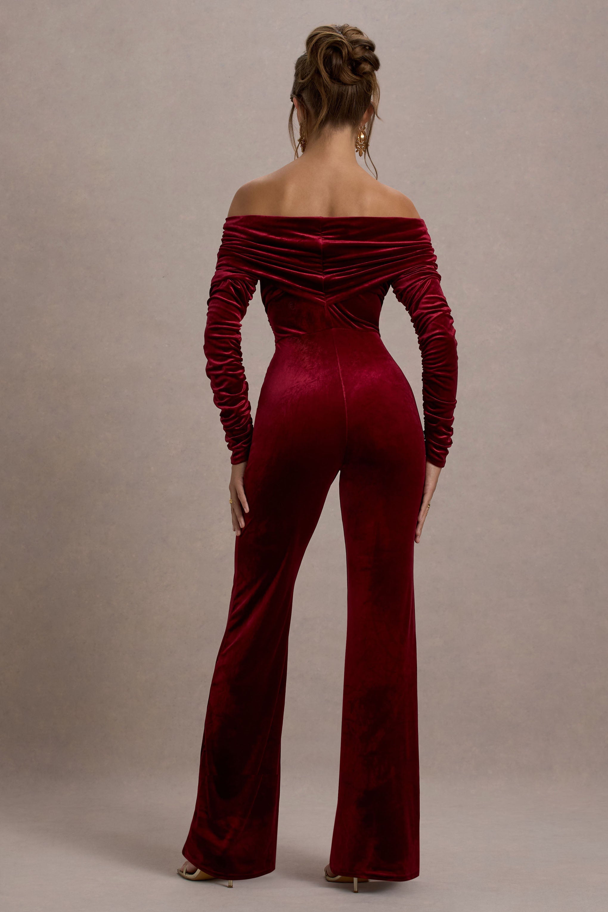 Borealis Berry Velvet Long-Sleeved Bardot Jumpsuit