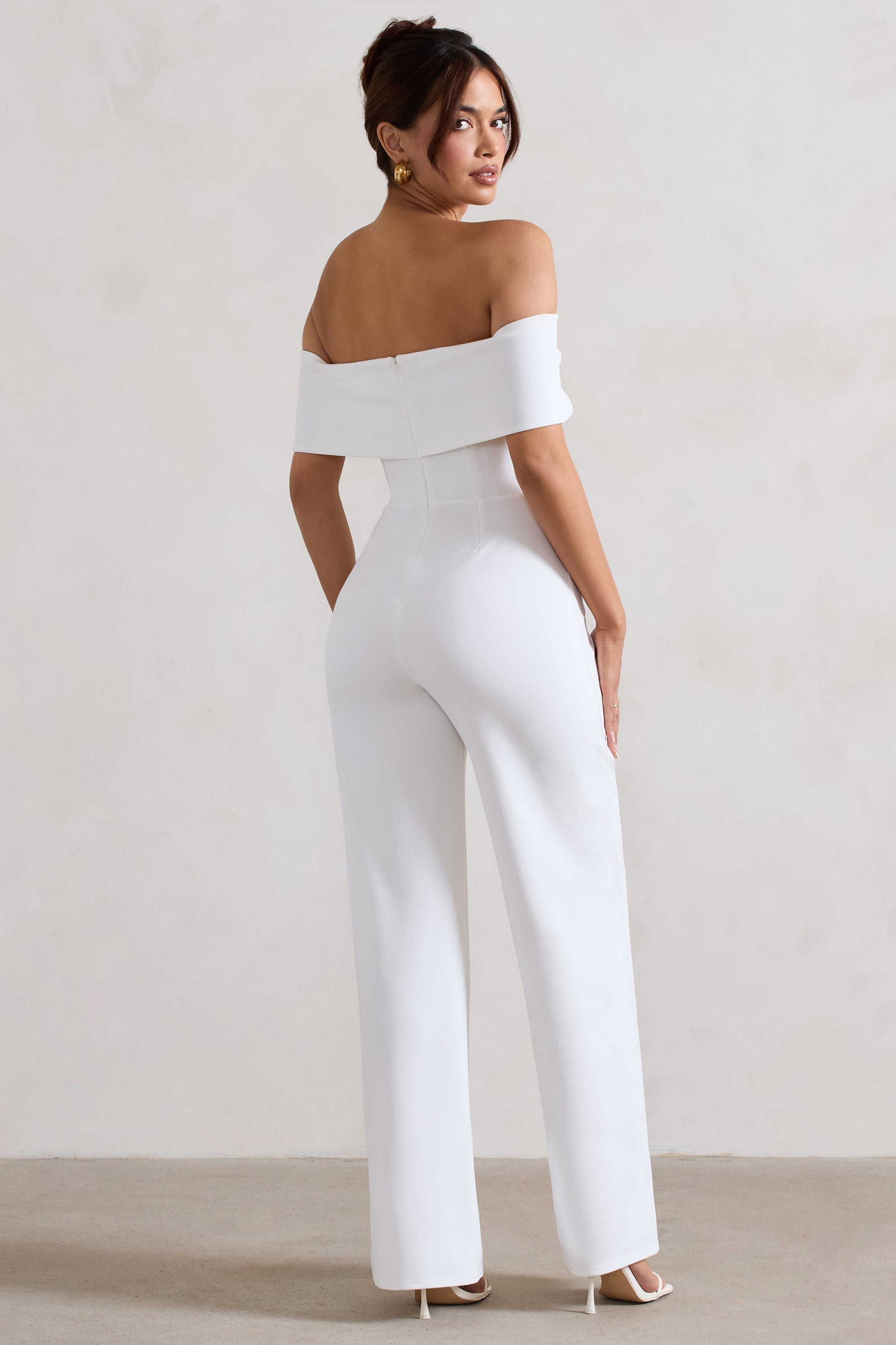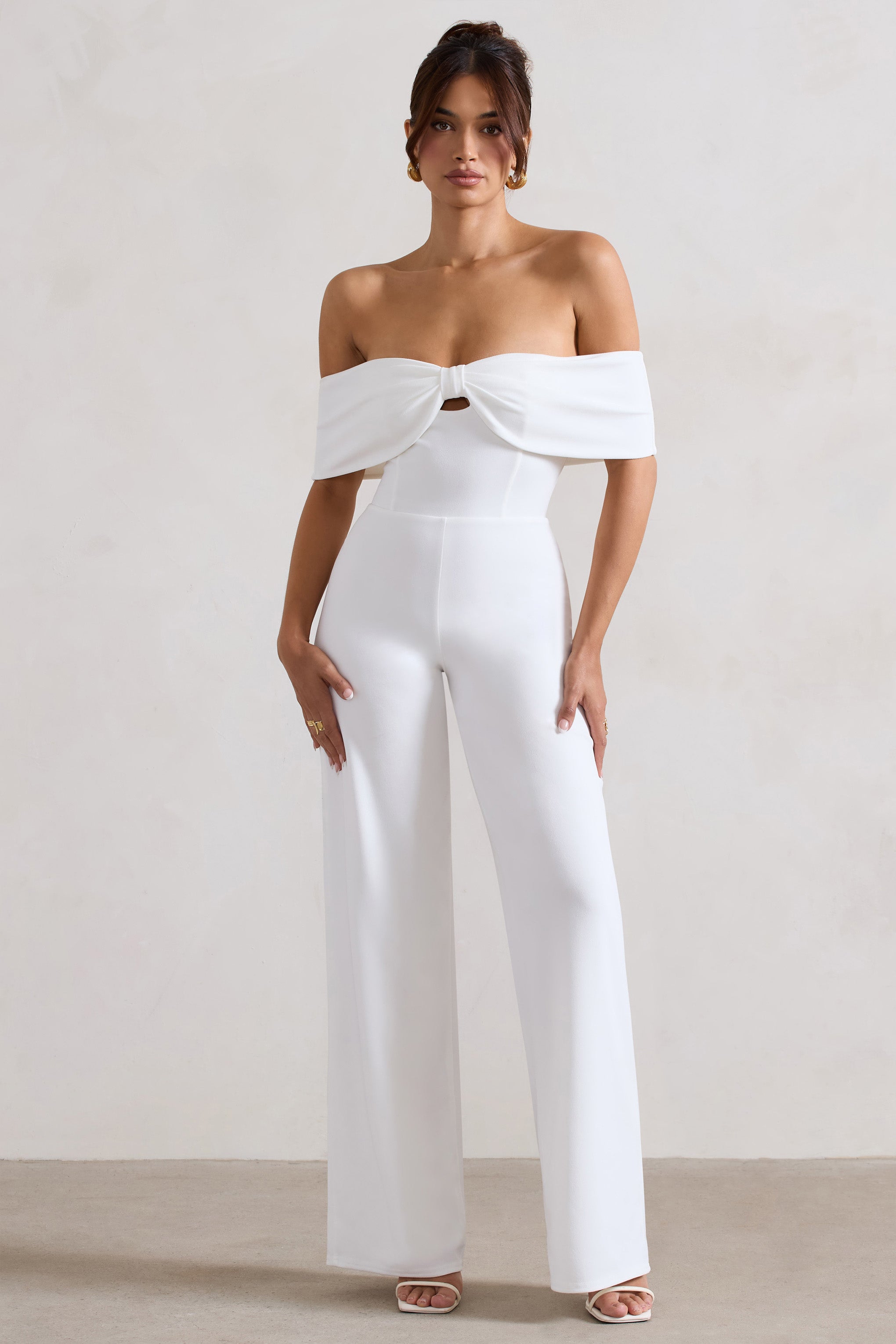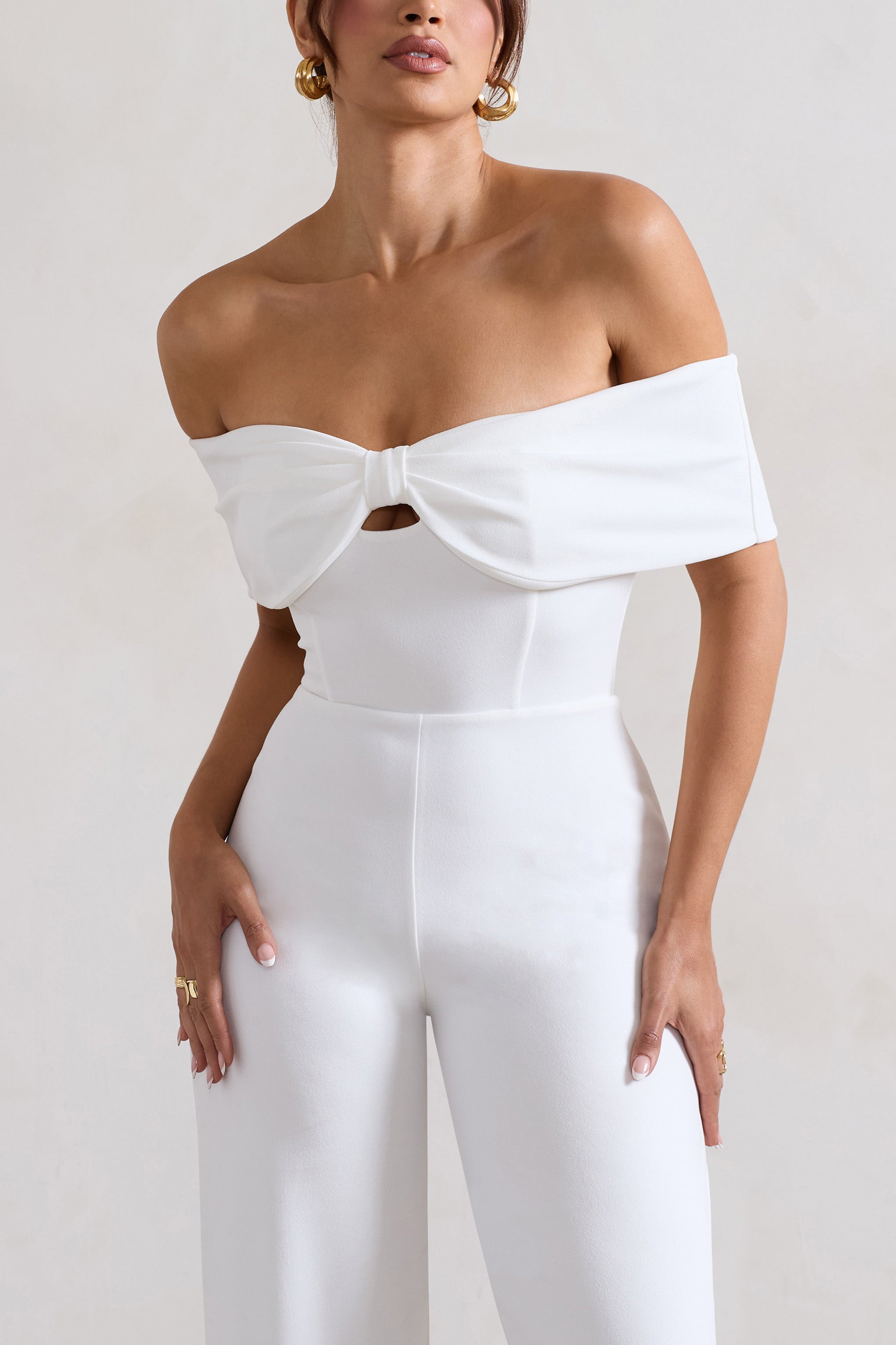 Harleen White Bow Bardot Wide-Leg Jumpsuit