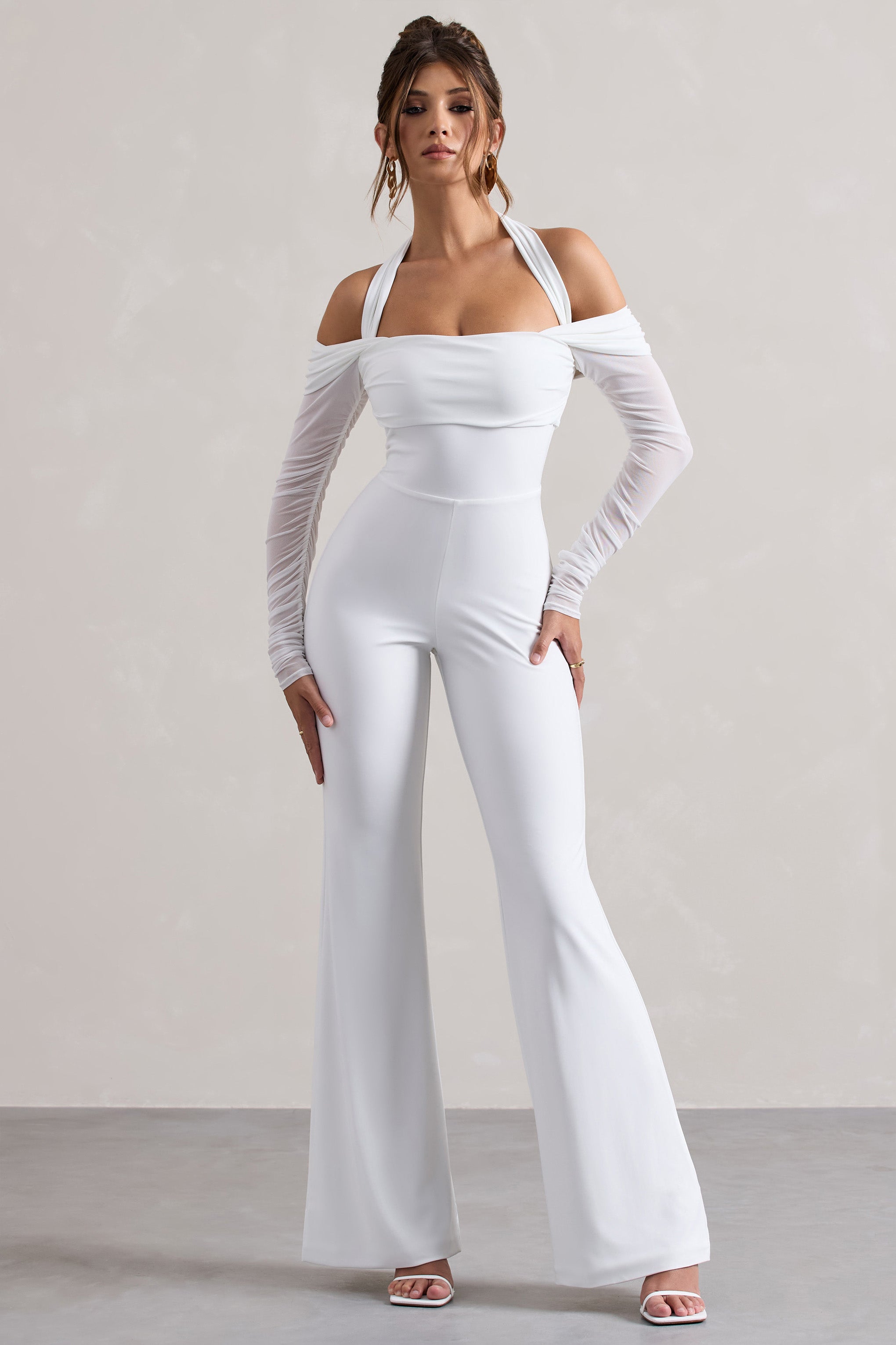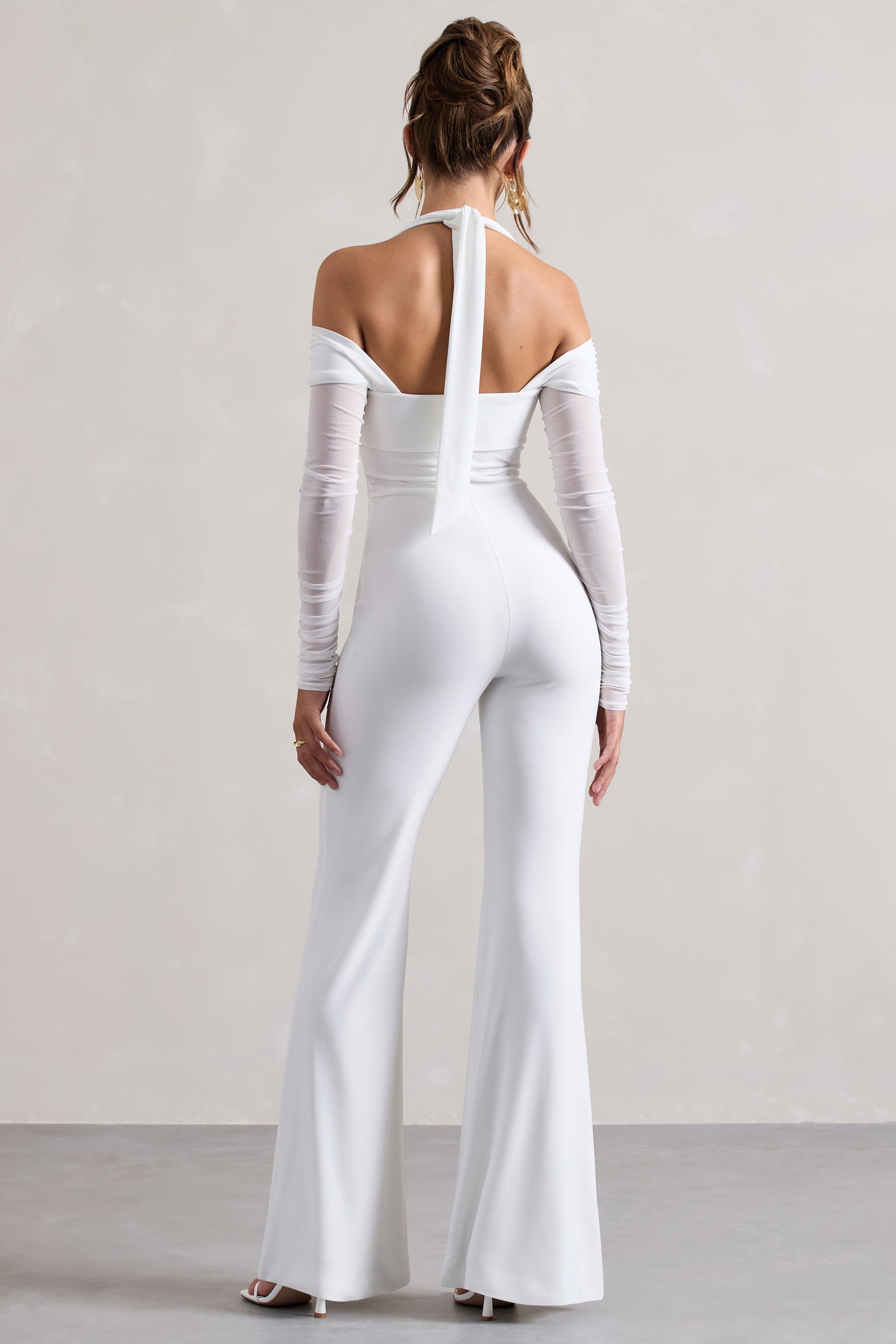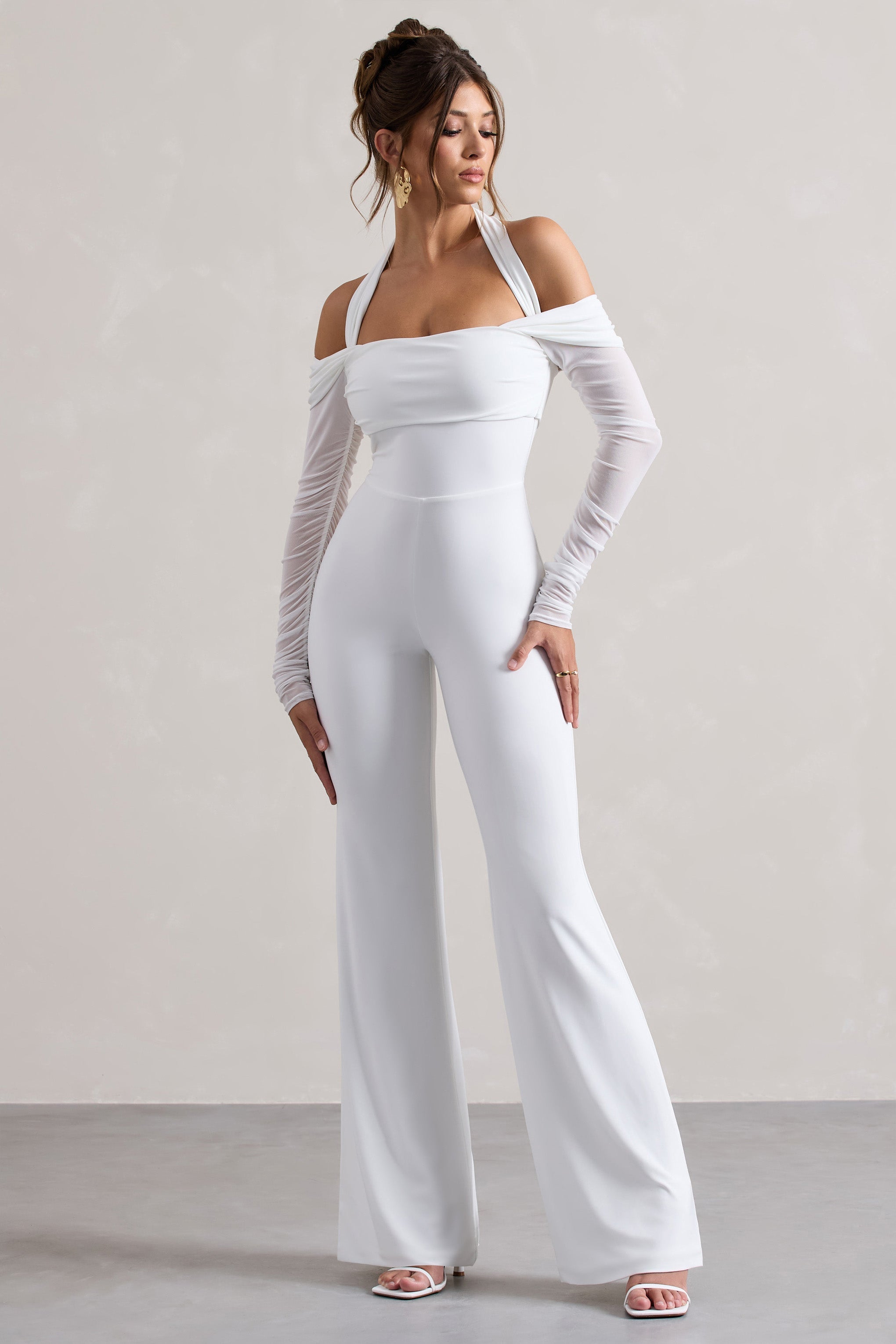 Captivate from all angles in Shannon. our latest staple jumpsuit. Cut in an opulent white shade of a premium stretch jersey for an ultra flattering fit. Shannon features a self-tie halter neckline and delicate sheer mesh sleeves. Style yours with a sleek bun and some gold earrings to complete the look.