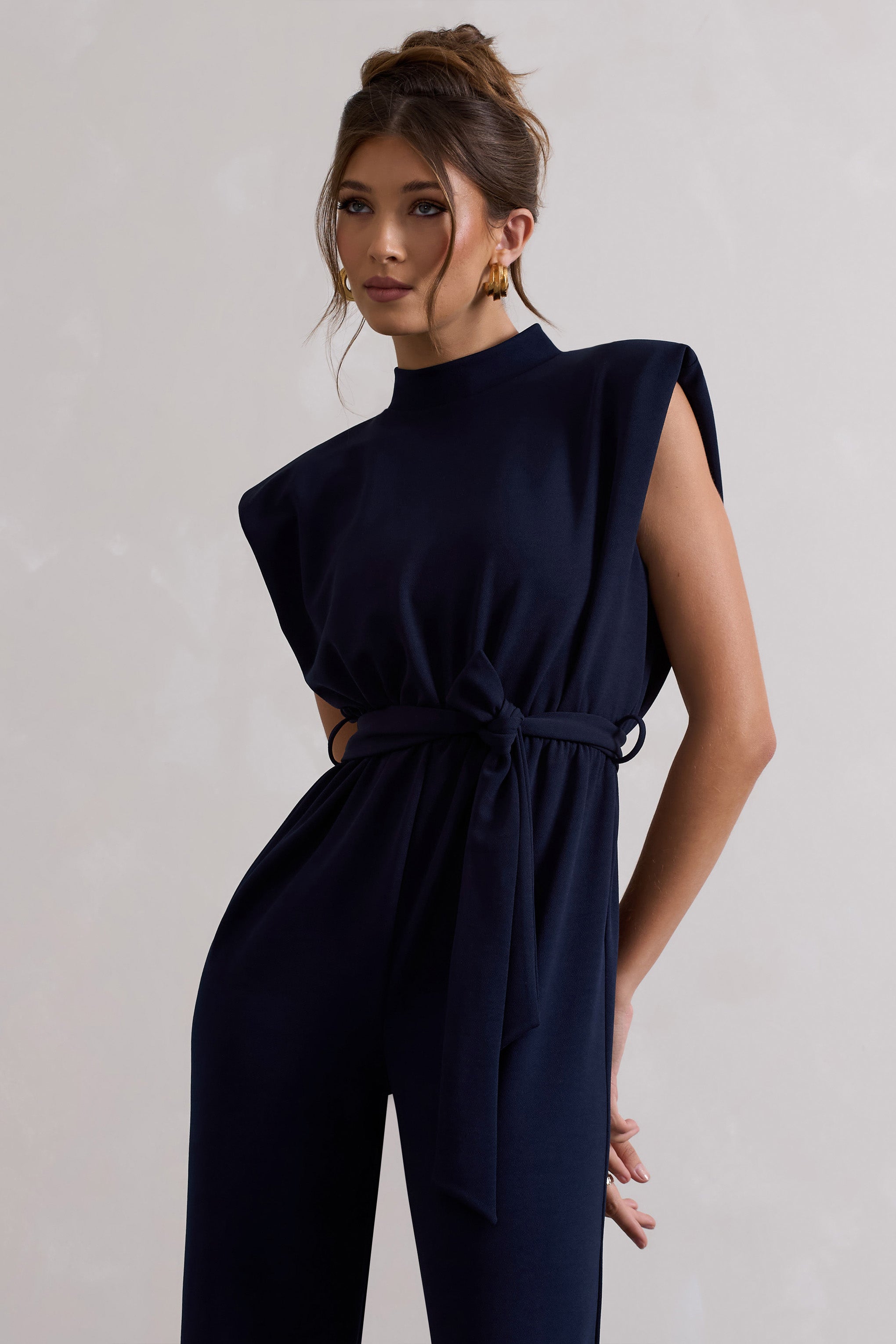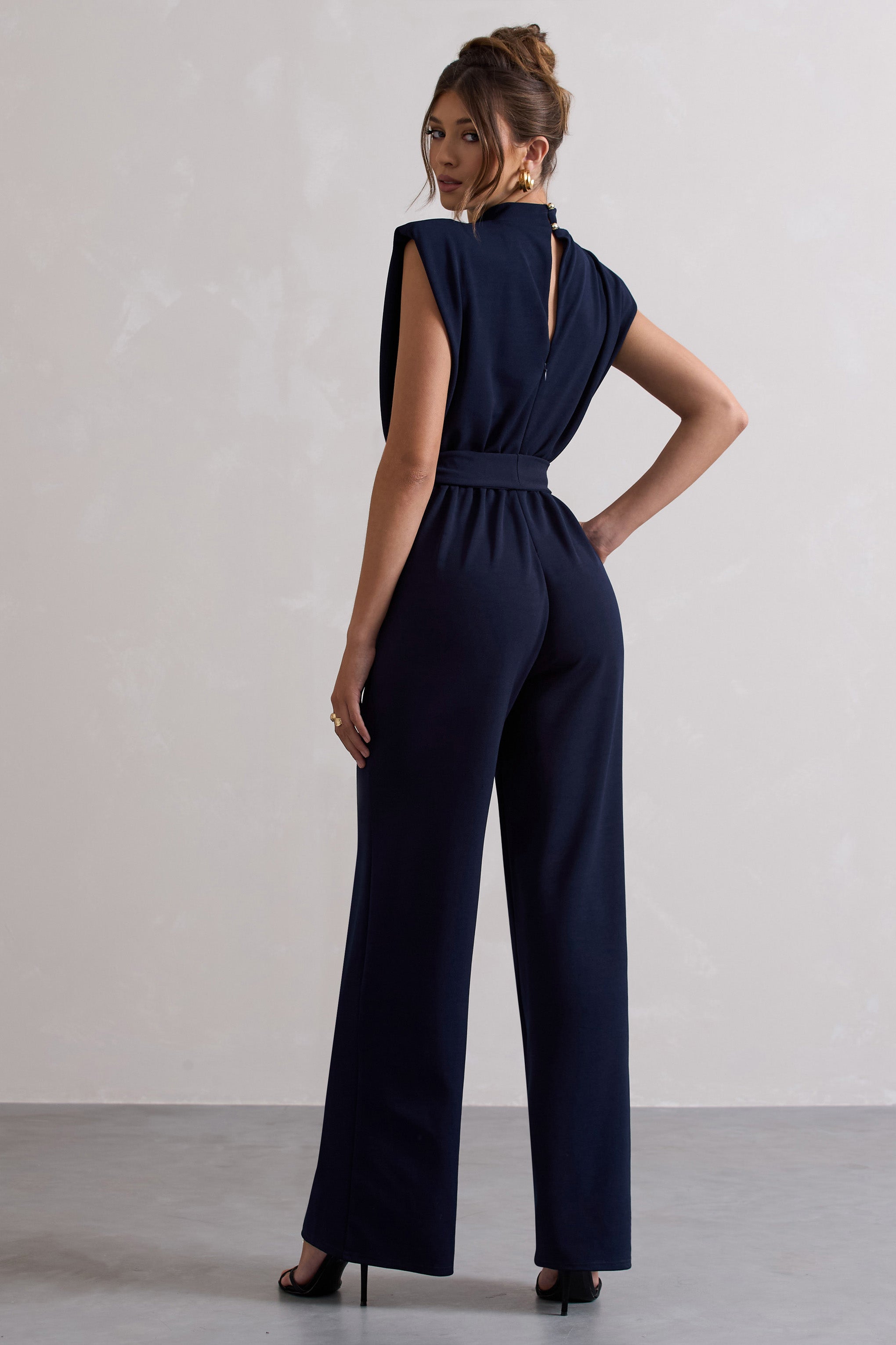 Kalona Navy High-Neck Wide-Leg Jumpsuit With Tie Waist