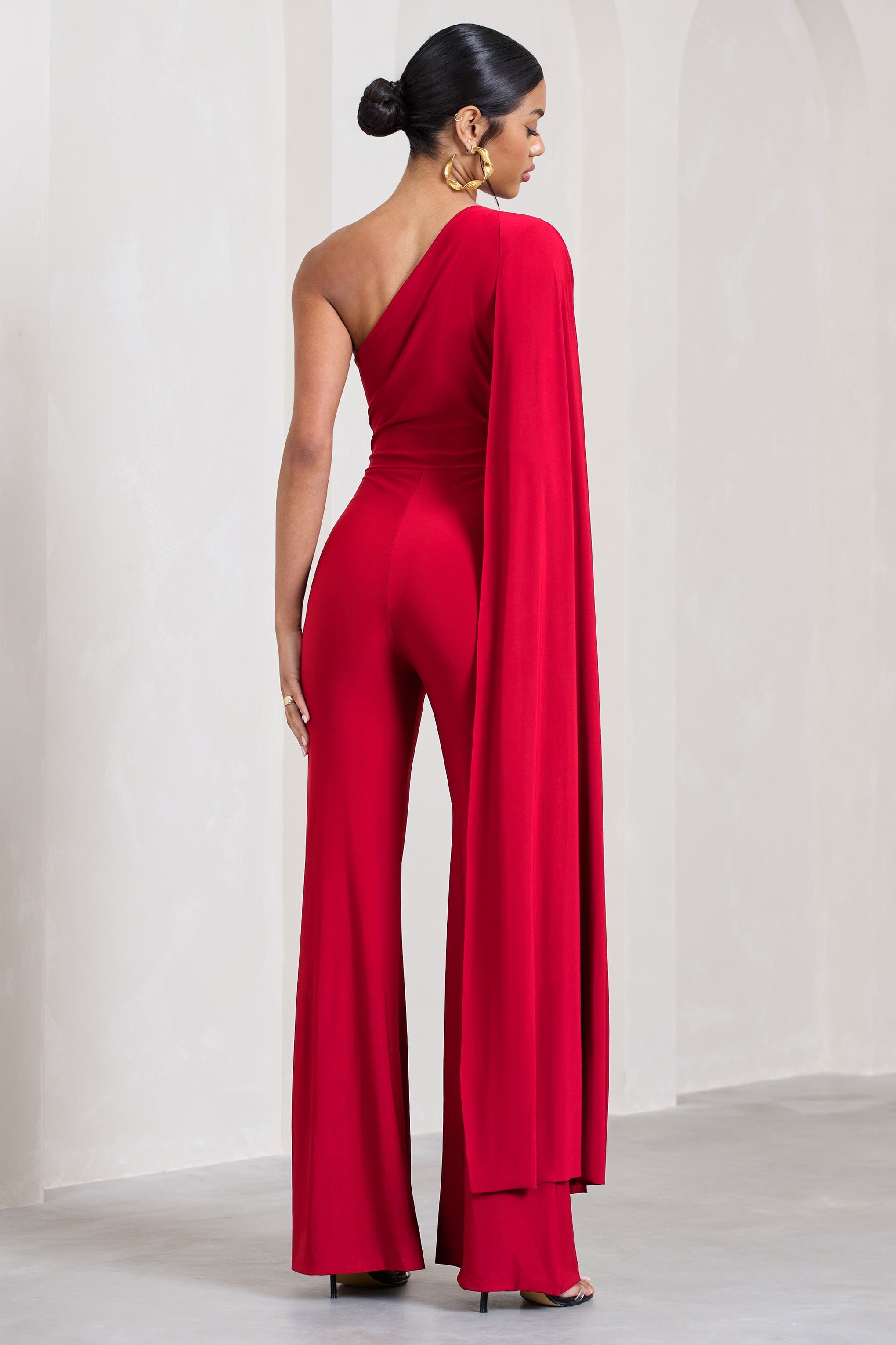 Aurora Red One Shoulder Cape Sleeve Jumpsuit