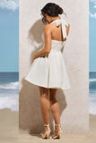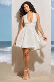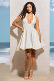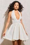 Add a opulent feminine touch to your summer wardrobe with our latest mini. Bloom. Crafted in a premium crepe in a crisp white Bloom boasts a plunge neckline with a self-tie halter. This style showcases a showcases a voluminous floaty skirt to sway in the summer breeze. perfect for those sunny days.