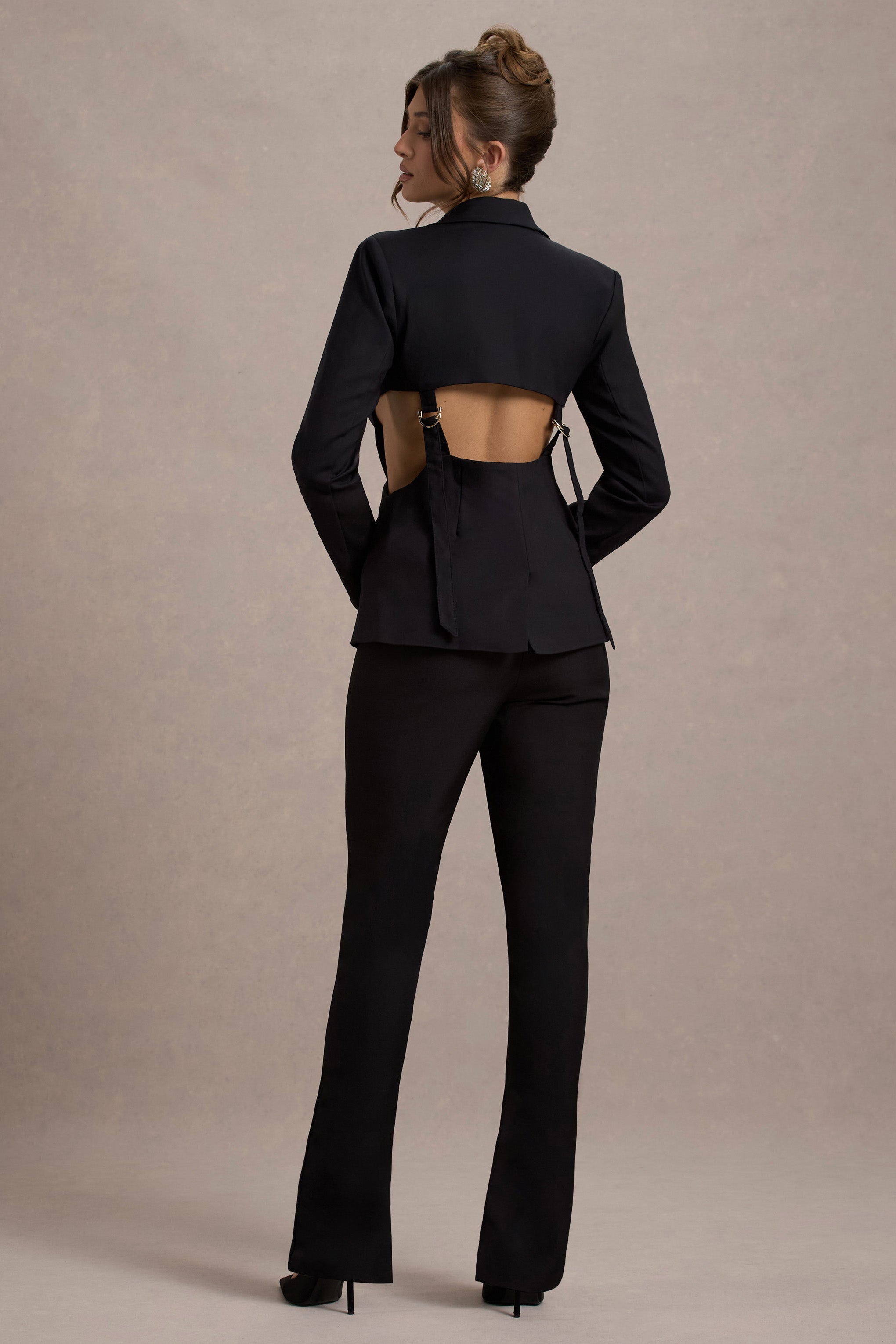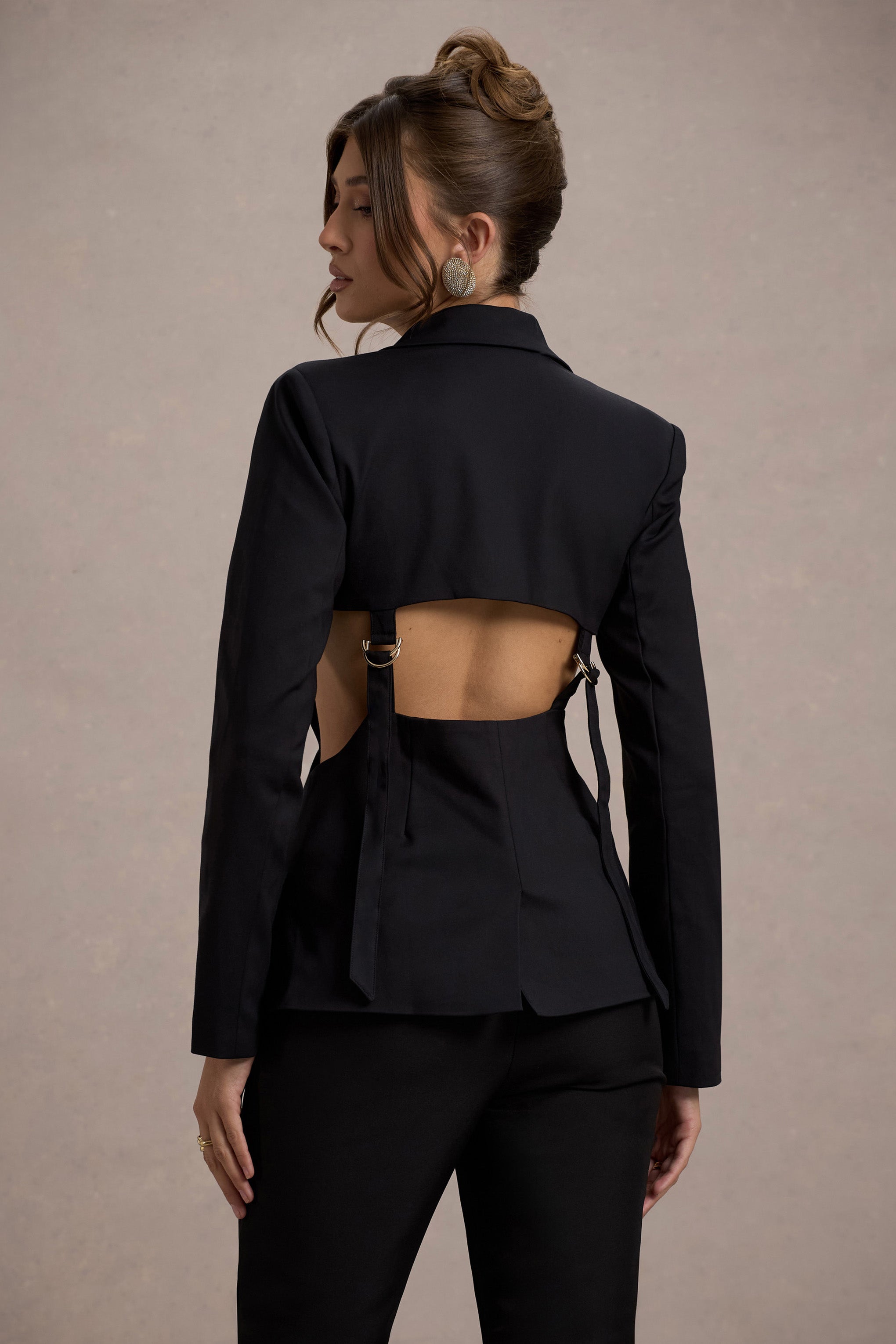 Set your sights on Fixation. our aptly-named black blazer constructed in a premium cotton blend. Featuring a tailored fit with a bold cut out back. this piece is the perfect combination of a classic silhouette with a new season edge. Captivate everyone's attention at your next event by pairing Fixation with a sleek bun and statement earrings.