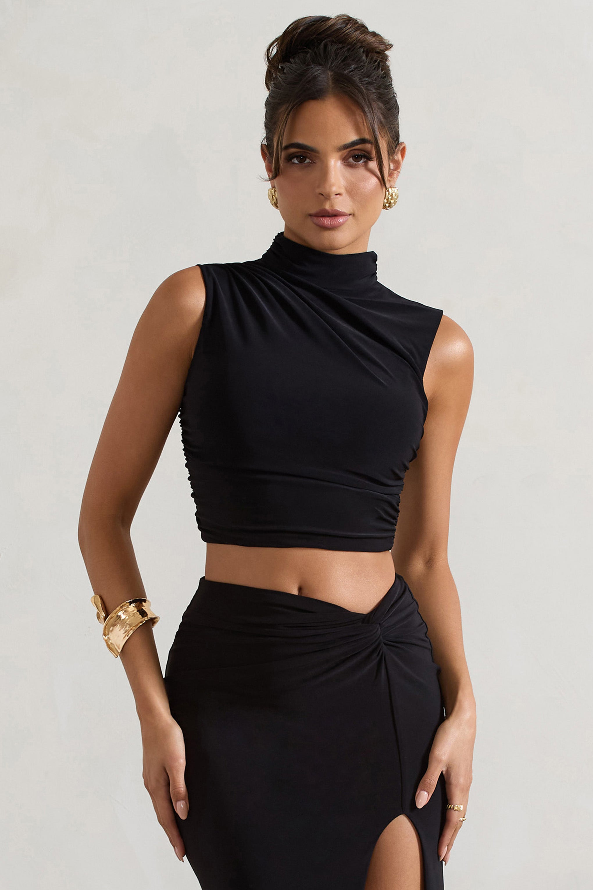 A fashion constant. every wardrobe needs a staple crop-top like Ischia. Designed in a classic black shade of our premium jersey. this piece features a high neckline. button-closed collar and sultry open back.