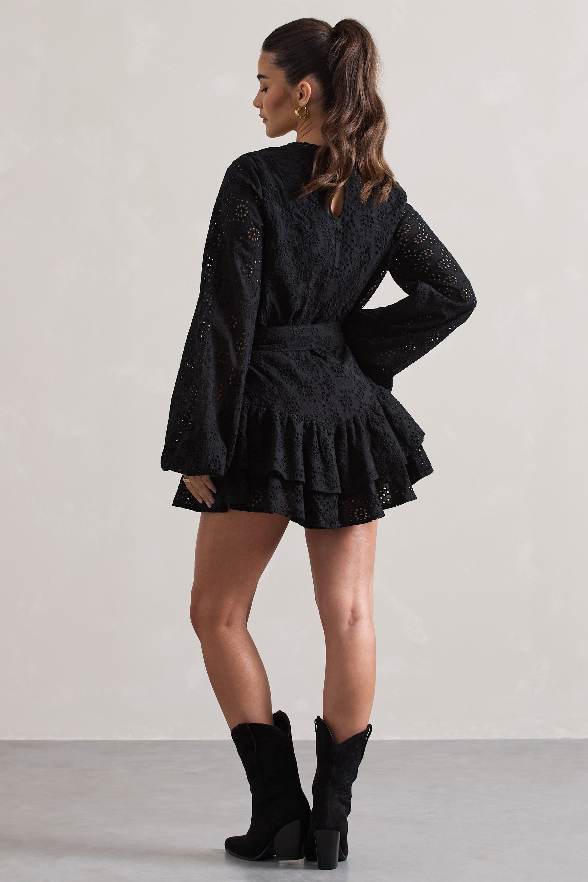 Traced with flouncy ruffles throughout. Places To Be is a romantic addition to your suitcase this summer. Crafted in a premium broderie anglaise. this black playsuit features a plunge neckline. balloon sleeves and belted waist to cinch your natural figure.