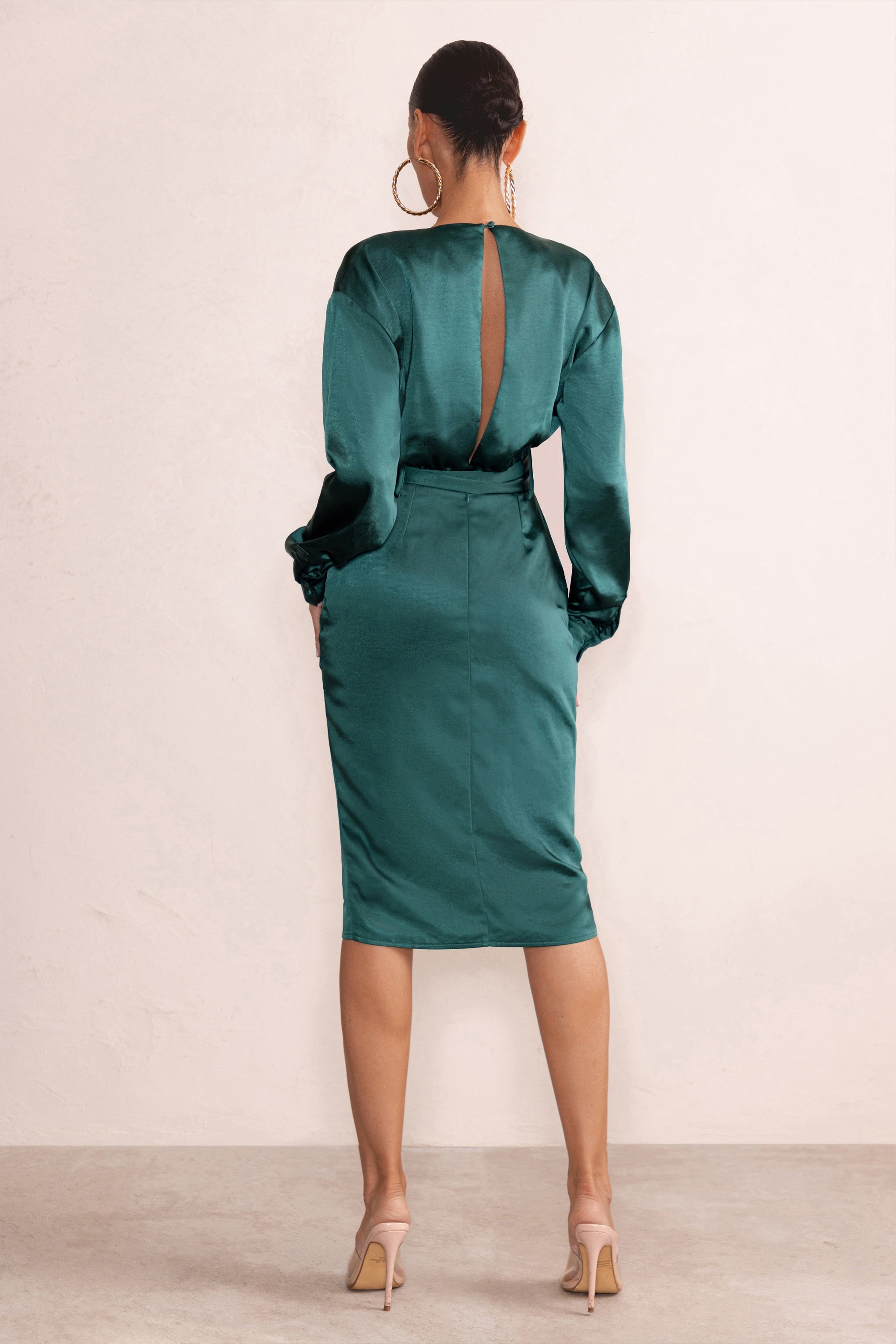 True Romance Bottle Green Satin Plunge Neck Midi Dress With Belt Detail